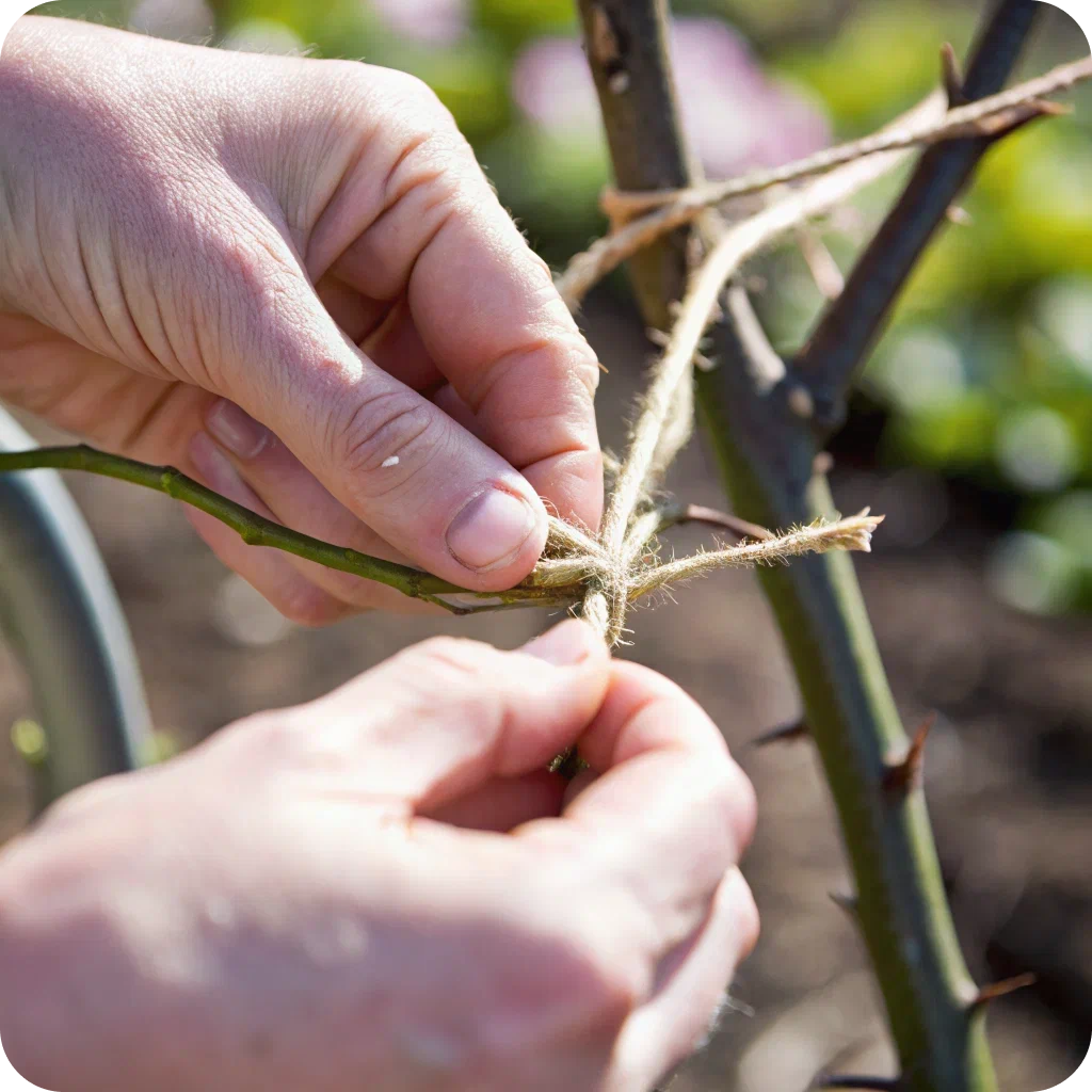 1. Снять плети с опор и аккуратно пригнуть к земле (жёсткие побеги лучше наклонять постепенно, в течение нескольких дней). Если побеги слишком жёсткие — пригибайте дугой, фиксируя в 2–3 местах.