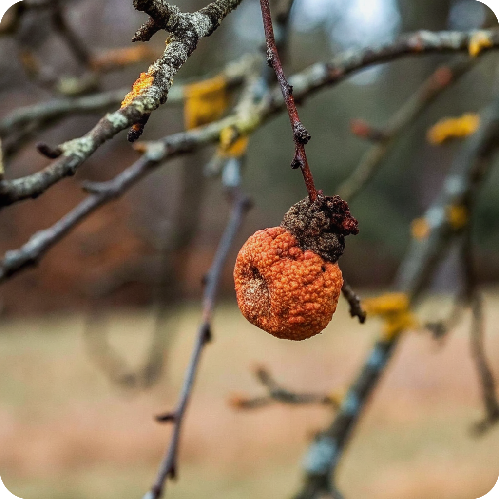 Особенно опасны плоды, которые «мумифицировались» прямо на ветках. Это признак грибковой инфекции самого дерева, и пока такие плоды висят на дереве, лечить его бесполезно. После зимовки на дереве образуются споры, которые способны заразить новые плоды.