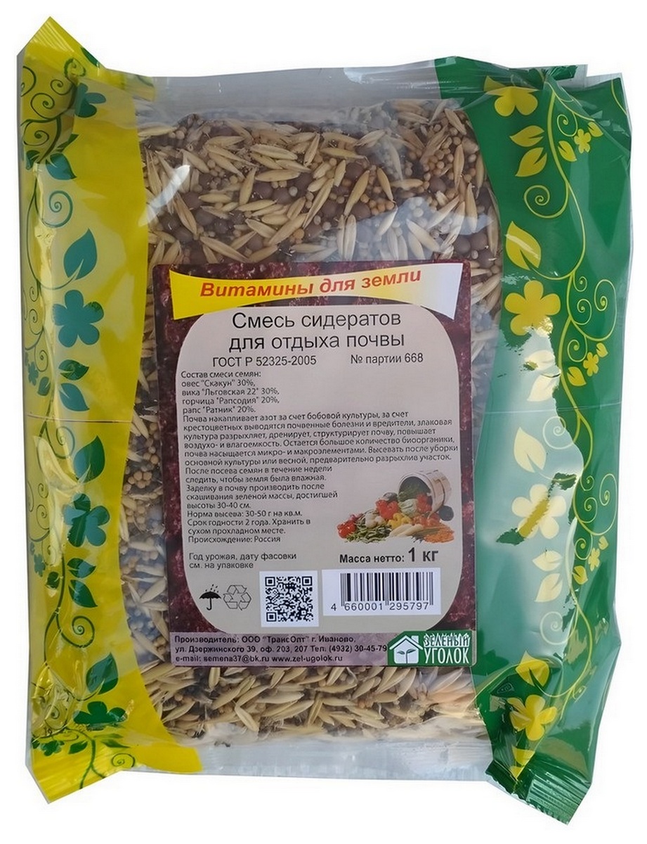 Состав: овес 30%, горох 20%, вика 20%, горчица 10%, редька масличная 10%, рапс 10%.