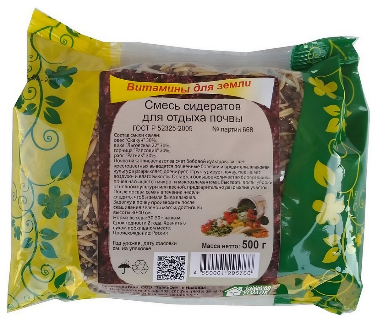 Состав: овес 30%, горох 20%, вика 20%, горчица 10%, редька масличная 10%, рапс 10%.