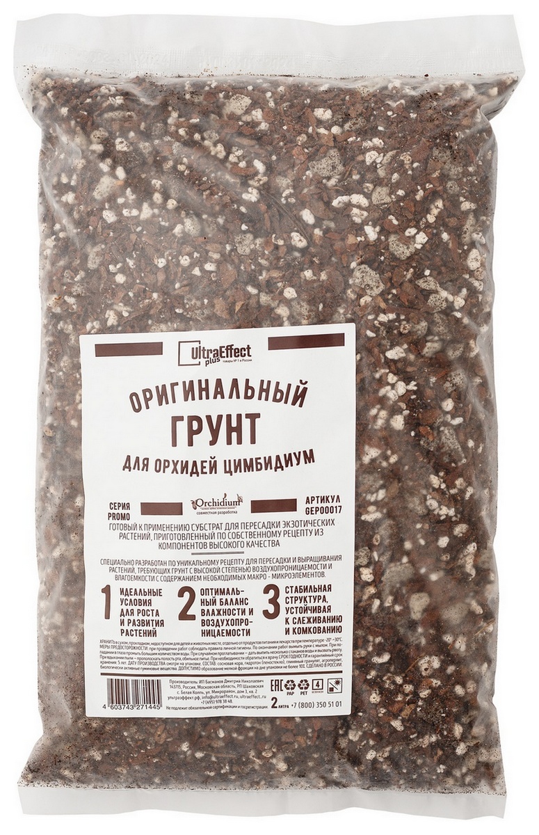 Оригинальный состав грунта для орхидей Цимбидиум UltraEffect+, разработан по уникальному рецепту и содержит все необходимые макро – микроэлементы для пересадки и выращивания растений. Уникальный состав готового грунта UltraEffect+ подойдет для требовательных экзотических растений, требующих для выращивания субстрат с высокой воздухопроницаемостью и оптимальной влагоемкостью. Правильно подобранные компоненты субстрата препятствует гниению корней и поддерживают оптимальный рН. При производстве грунта применяются 100% натуральные природные ингредиенты.