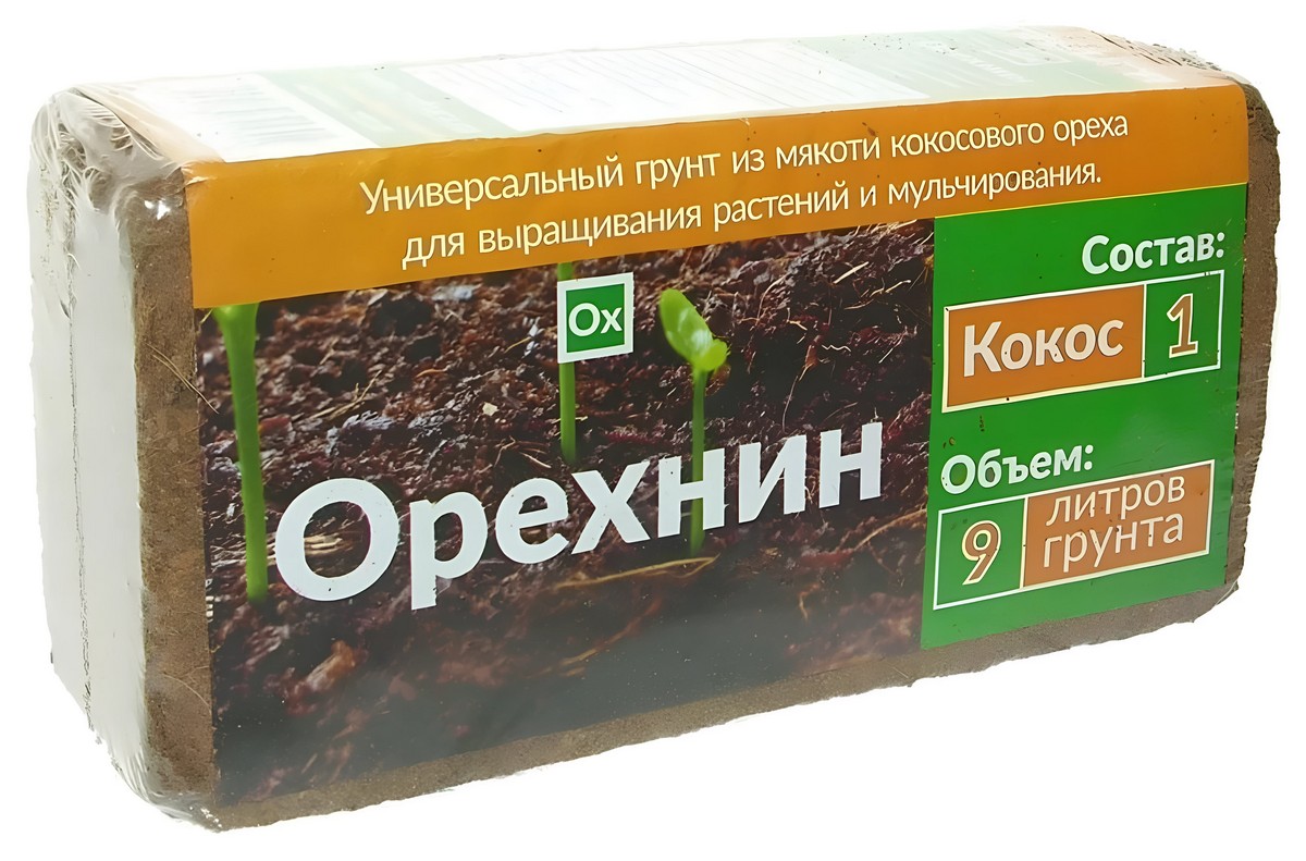 Орехнин – это экологически чистый органический материал, не содержит химических примесей, изготовляется из скорлупы и волокон кокосового ореха без клея и пропитки. Орехнин улучшает структуру, воздухоемкость, пористость грунта; увеличивает действие удобрений; препятствует слёживанию и удерживает влагу в почве; стимулирует развития корневой системы; повышает урожайность культур; субстрат препятствуют развитию патогенных микроорганизмов. рН нейтральный. Орехнин стойкий к разложению, в течение 5 лет сохраняет физико-химические свойства, не уплотнятся и не снижает качеств влаго и воздухоёмкости. Грунт из мякоти кокосового ореха – идеален для рассады, проращивания семян, укоренения черенков и саженцев; приготовления питательного почвогрунта для фиалок, орхидей, пальм и др.; мульчирования; выращивание овощей и ягод методом гидропоники; для хранения луковичных цветов и корней саженцев.