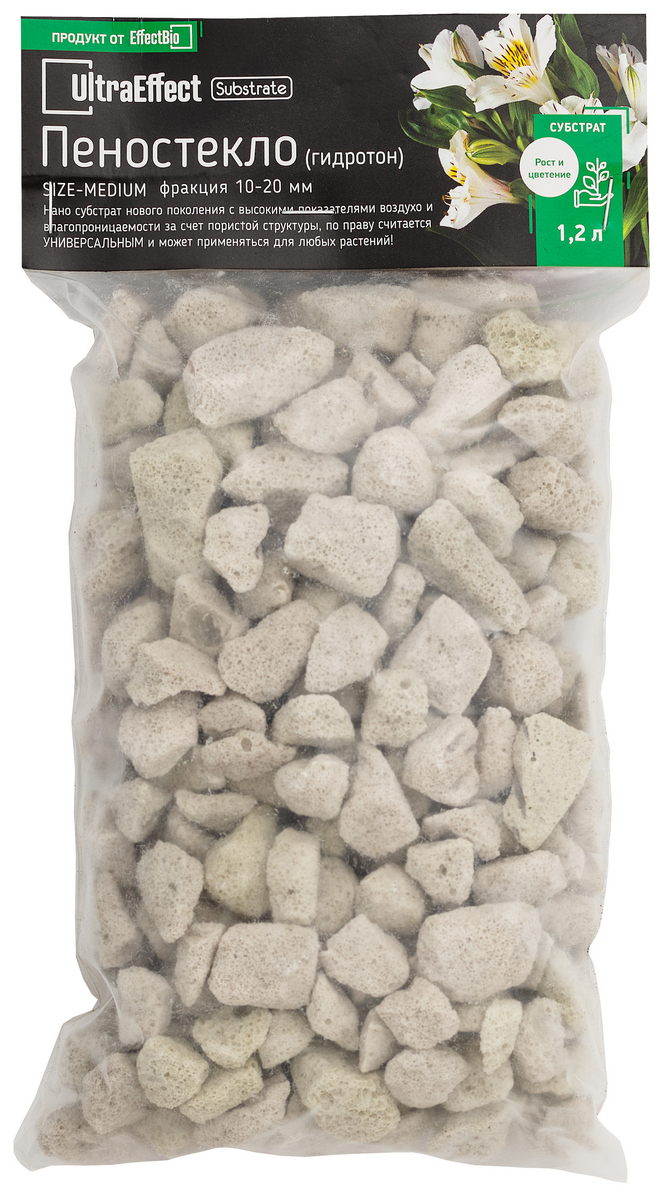 «Пеностекло для растений UltraEffect фр 4–10 мм 1,2 л гранулированное» - универсальный субстрат для гидропоники, комнатных и садовых растений, овощных культур. Благодаря высокой степени пористости является буфером для макро- и микроэлементов, которые способствуют быстрому росту и высокой выживаемости. Препятствует образованию плесени, закислению и комкованию субстрата. Препятствует загниванию корневой системы, переливу и уменьшает частоту поливов. Применяется в качестве дренажа или субстрата, смешивается в необходимых пропорциях с другими компонентами грунта согласно рецептуре приготовления.