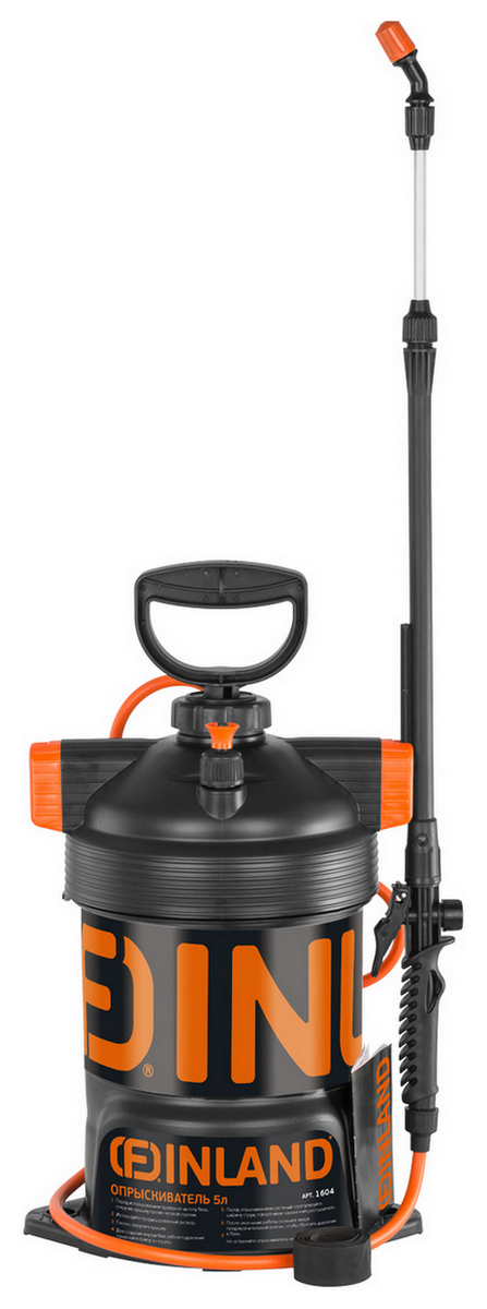Опрыскиватель помповый 5л FINLAND 1604. Для ухода за садово-огородными растениями. Баллон из качественного пластика, устойчивого к агрессивным веществам, содержащимся в удобрениях. Регулируемая мощность напора: от сильной струи до мелкодисперсного тумана. Изогнутый наконечник телескопической штанги-распылителя для обработки труднодоступных мест. Фиксация курка подачи жидкости для длительного распыления. Предохранительный клапан для моментального сброса давления внутри баллона. Широкое основание для устойчивого расположения на горизонтальной поверхности. Широкая горловина для удобного заполнения баллона жидкостью. Эргономичный дизайн рукоятки насоса и выступы для ног в основании баллона для облегчения нагнетания давления жидкости. Плечевой ремень для комфортной переноски опрыскивателя во время использования.