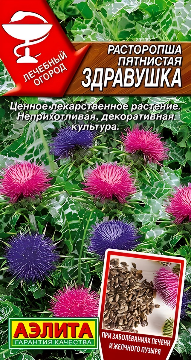 Лекарственное, эфиро-масличное, двулетнее растение высотой 1-1,5 м. В средней полосе выращивается как однолетняя культура. В медицинских целях используются все части растения. Семена собирают с августа по октябрь, заготовку корней и листьев проводят осенью, после сбора семян. Расторопша содержит силимарин, редко встречающийся в природе и являющийся средством для профилактики и лечения заболеваний печени и желчного пузыря. Сорт отлично подходит для приготовления целебного фиточая. Очень декоративен в саду. Дает самосев.