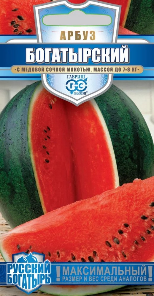 Среднепоздний (90-95 дней от всходов до первого сбора плодов) сорт для выращивания в открытом грунте (южные регионы) и пленочных теплицах. Сочетает превосходное качество крупных плодов с высокой урожайностью даже в неблагоприятное лето. Растение мощное, плетистое, главная плеть более 5 м. Плод удлиненно-шаровидный с рисунком из темно-зеленых, почти черных шиповатых полос, средняя масса — 5,2 кг (при хорошем уходе до 7-8 кг). Кора тонкая, кожистая. Мякоть ярко-красная, мелкозернистая, медовая, сочная, с насыщенным арбузным ароматом. Сорт устойчив к основным заболеваниям, плоды хорошо хранятся (3 месяца после съема).