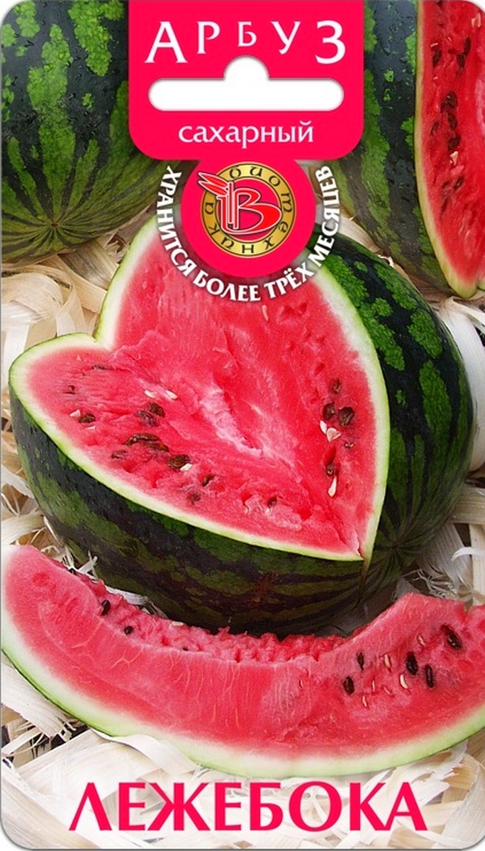 Арбуз Лежебока.Сахарный сорт арбуза, пригодный для выращивания в пленочных теплицах.Обладает таким ценным свойством, как лежкоспособность в течении 3,0-3,5 месяцев после съема плода, благодаря чему можно порадовать себя спелым, ароматным арбузом к Новому Году! Растение с мощным ростом, длинноплетистое.Лист крупный, зеленый, с опушением, узко-дольный, среднерассеченный. Плод овально-шаровидный, средняя масса товарного плода 4,2 кг. Поверхность слабосерментированная, фон зеленый, рисунок – темно-зеленые, почти черные, шиповатые полосы. Кора средней толщины, на разрезе светло-зеленая. Мякоть интенсивно-красная, зернистая, нежная, сладкая.Для получения гарантированного урожая в регионах с умеренным и прохладным климатом необходимо применить рассадный способ выращивания. Посев на рассаду проводят в горшочки с питательной смесью диаметром 10 см. Ко времени высадки рассады температура почвы в пленочной теплице должна прогреться до 14-16°С, а растения достигнуть возраста 30-35 суток и иметь 3-4 настоящих листа.