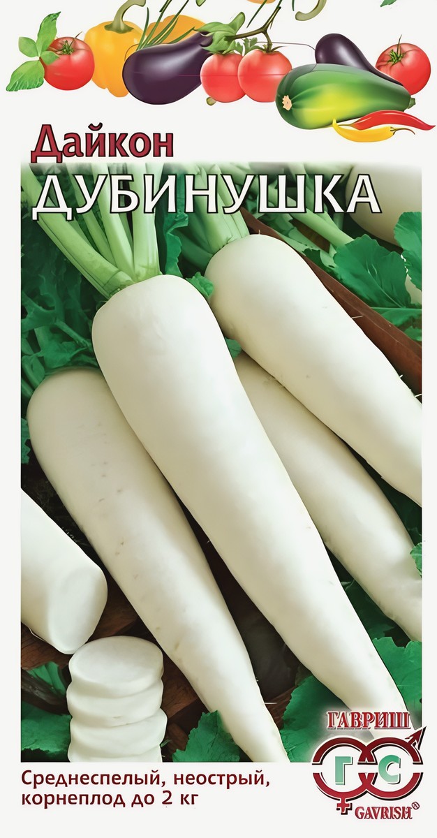 Сорт раннеспелый (от всходов до технической спелости 50-60 дней). Корнеплоды гладкие, белые, цилиндрические с коническим сбегом, массой 0,9-1,0 кг, длиной 30-60 см, погружены в почву на 1/3-1/2 длины. Мякоть очень сочная, нежная, белая, сладковатого освежающего вкуса, без острого привкуса. Урожайность – 10-12 кг/м2. Устойчив к стрелкованию. Корнеплоды дайкона используются в свежем, вареном и соленом виде. Посев семян в открытый грунт по 2-4 шт. в лунку на глубину 2-3 см. В фазе двух-трех настоящих листьев растения прореживают. Растениям необходимы своевременные поливы, прополки, рыхления и подкормки. Убирают в один прием до наступления заморозков. Корнеплоды хранят в песке.