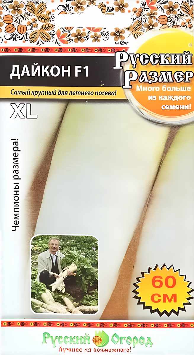 Дайкон Русский Размер F1 - самый раннеспелый и крупноплодный гибрид для летнего посева. Быстро набирает вес и легко выращивается! Готов к уборке уже через 45 дней от всходов, и это отличный результат даже для посадки в северных регионах нашей страны! При посеве в конце июля, к октябрю достигает 60 см в длину и 12 см в диаметре. Отменные габариты, ведь одного корнеплода хватит практически на большой семейный обед! Мякоть отличного вкуса, сохраняет сочность при хранении. Высаживается прямой посадкой в открытый грунт. Дайкон не любит свежих органических удобрений. Местоположение должно быть солнечным и без ветров, грядки предпочтительнее сделать высокими. Семена заглубляют на уровень 3-5 см, хорошенько поливают. Далее следует стандартная процедура ухода: прополка, аккуратное рыхление, полив.