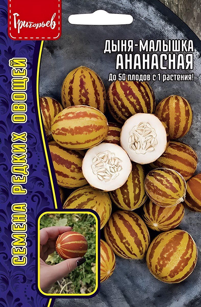 Это интересный сорт для кулинарных экспериментов и заготовок! Он обладает не только отличными вкусовыми качествами, но и полезными свойствами. Плоды овально-вытянутые, достигают длины до 10 см. Масса одного плода составляет 100-200 г. В технической спелости плоды имеют зелёно-полосатую окраску, которая по мере созревания переходит в оранжевый цвет с желтоватыми полосами. Мякоть тёмно-оранжевая, сладкая, ароматная. Однако в ней присутствует лёгкий пикантный кисловатый привкус, напоминающий ананас. Оно мощное, с длинными плетями, достигающими 400 см. Урожайность высокая - до 50 плодов с одного растения за 2–3 месяца вегетации. Растение устойчиво к болезням и погодным условиям, что делает его более надёжным выбором по сравнению с обычными дынями. Оно продолжает плодоносить даже до наступления заморозков. Перед посадкой семена нужно закалить в течение 1-3 дней в прохладном месте, а затем замочить на ночь в тёплой воде. В южных регионах их можно сразу сажать в почву, а в остальных — лучше выращивать рассаду.