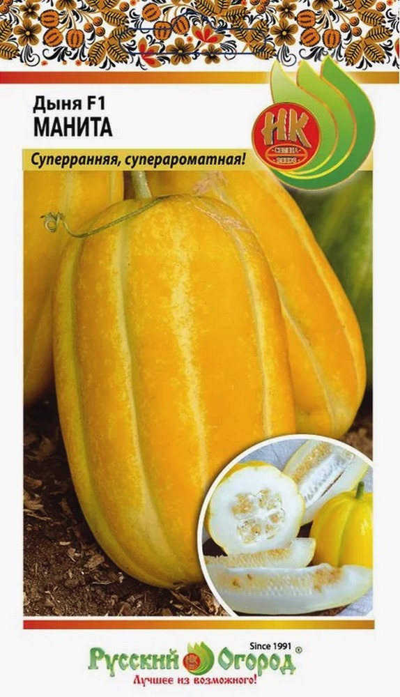 Суперранний сорт,сроки созревания 60-65 дней. Плоды смугло-желтые, овальные, сегментированные, весом около 600 г. Кожура тонкая. Мякоть кремовая, плотная, хрустящая, сладкая, с очень ярким, насыщенным дынным ароматом.
