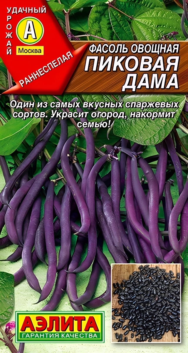 Неприхотливый сорт с высоким содержанием белка. Это делает его незаменимым для вегетарианского и постного питания. Растение вьющееся, вырастает до 1,5 м. Бобы длиной 10-12 см, слегка изогнутые. Количество семян 3-4 шт., размером 2-2,5 см. Семена в недозрелом виде бело-розового цвета, после созревания становятся темно-фиолетовые с белыми пятнами. Идеально подходит для приготовления супов, гарниров и для заморозки.