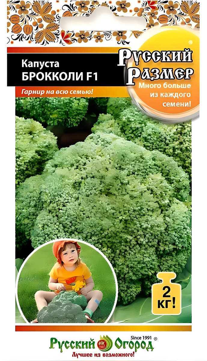 Брокколи – это однолетнее растение, которое относится к семейству капустных, является одной из разновидностей цветной капусты. Брокколи родом из Средиземноморья и Малой Азии. Брокколи называют кладезем витаминов и аминокислот. Растительного белка в ее составе в полтора раза больше, чем у цветной капусты. Брокколи обладает сильным антимикробным действием, а также известна своей эффективностью в профилактике онкозаболеваний. Это низкокалорийный продукт.«F1 Русский Размер» - самая крупная капуста среди всех сортов брокколи. Высаживается в открытый грунт в виде рассады, которая уже достигла в возрасте 40-45 дней. Пересадку из теплицы в грунт можно проводить с конца мая и до конца июня. Первый урожай можно получить уже в середине июля, плодоносить брокколи будет вплоть до поздней осени. Для подготовки рассады семена закладывают на глубину 0,5 см. Оптимальная температура для прорастания – 20 градусов. Всходы появляются на 7-10 день.Брокколи требует открытого солнечного места, рыхлой и хорошо увлажненной почвы.
