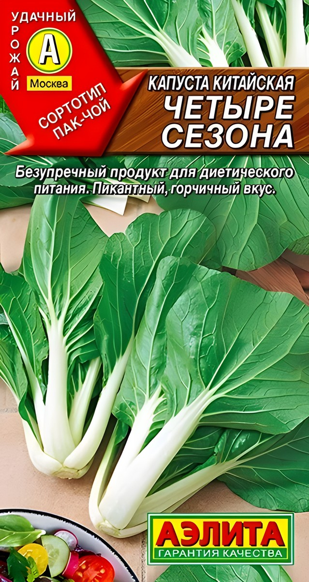 Популярный отечественный сорт китайской капусты, которая известна также как горчичная, или пак чой. Ценится за скороспелость (45 дней от всходов) и высокое содержание лизина – незаменимой аминокислоты, редкой в овощах. Формирует прямостоячую розетку листьев диаметром 20-30 см. Листья с черешками употребляют в пищу свежими, жареными, тушёными и квашеными. Листья некрупные, округло-овальные, черешки мясистые, 8-14 см длиной. Масса одного растения 1-1,8 кг, масса черешков составляет 2/3 от массы растения. Урожайность высокая – 9 кг/м2. Вкус приятный, с пикантной остротой. Посев семян в открытый грунт в два срока – весной (конец апреля-начало мая) и во второй половине лета (июль-август). Летний посев обеспечивает более высокий и качественный урожай. С весенним посевом задерживаться нельзя, при длине дня более 13 часов велика вероятность стеблевания растений.