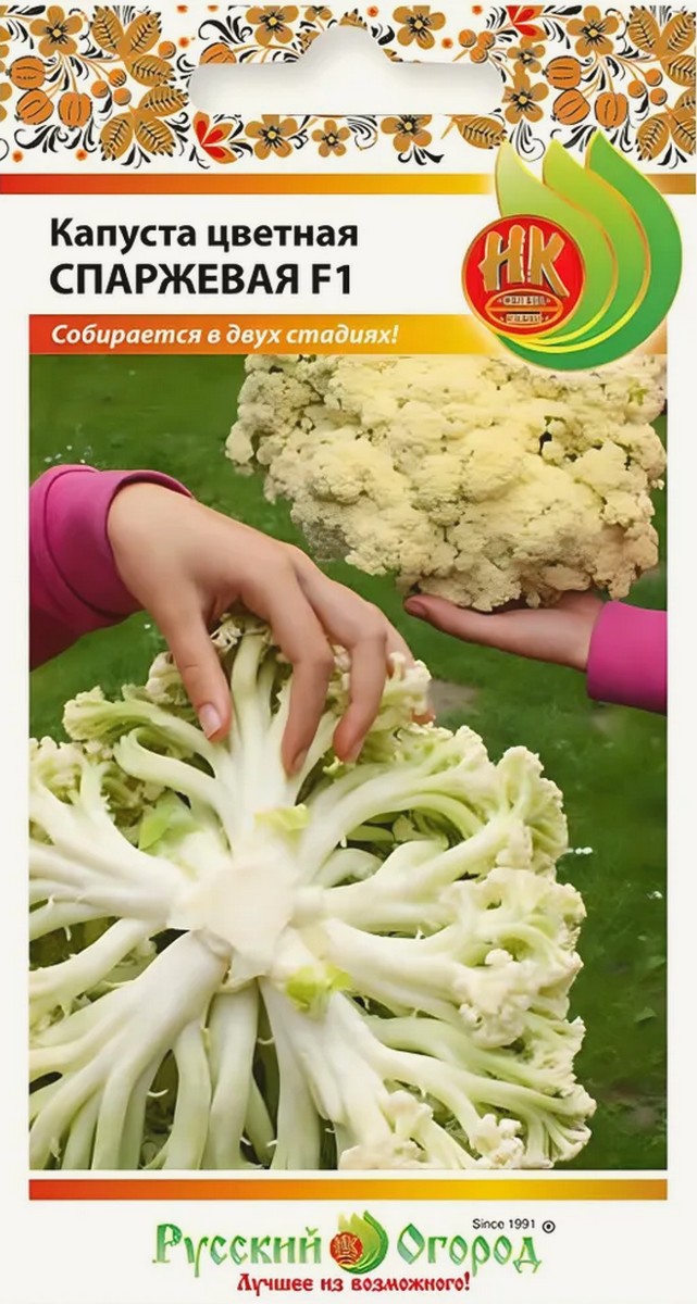 Капуста цветная Спаржевая F1 отличается двумя стадиями спелости! Её настолько удобно и несложно выращивать, что многие садоводы сделали спаржевую капусту почетным гостем своего огорода. Сорт Спаржевая F1 - раннеспелый гибрид, пригодный для уборки в двух стадиях: в молочной, когда головка плотная, стандартного вида, и более поздней – технической, когда побеги удлиняются, как побеги спаржи, и головка становится рыхлой. Благодаря такой структуре она быстро готовится и сохраняет максимум полезных свойств (особенно при использовании сковороды - вок). Головка кремово-белая, массой от 500г до 800 г, с приятнейшим сладковатым вкусом. Никогда не горчит. Начинает созревать через 70-80 дней после посева.