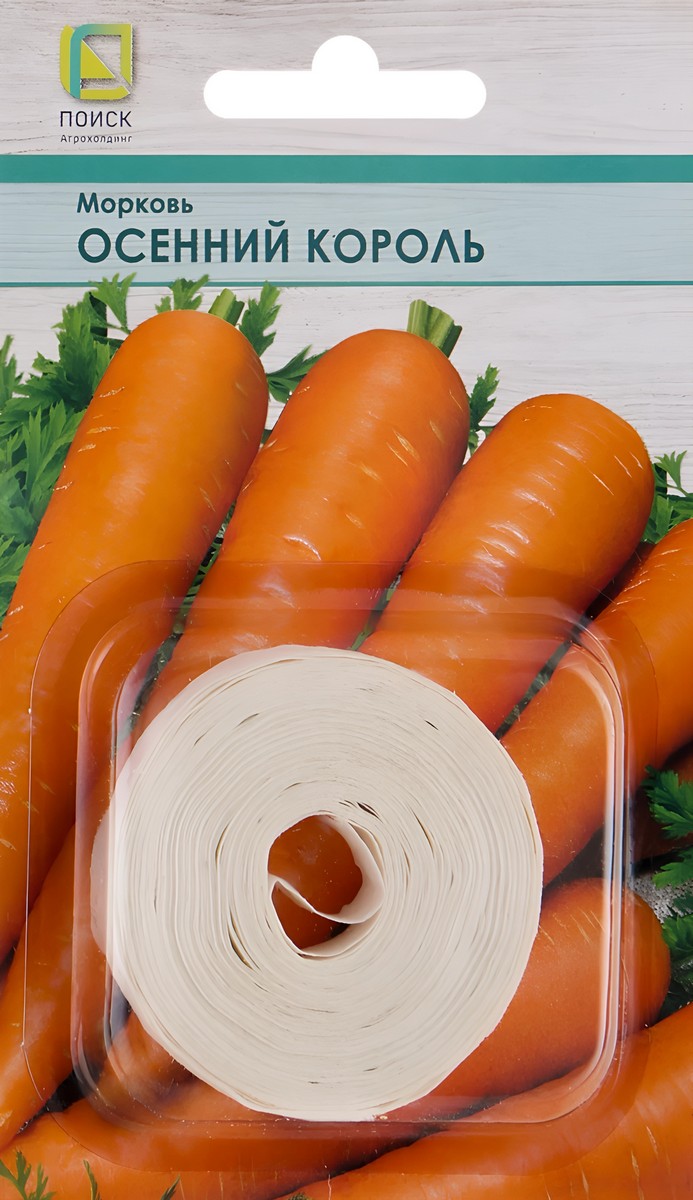 Морковь сорта Осенний король относится к среднепозднему виду. Срок созревания от момента первых всходов составляет 110-115 дней. Длина корнеплодов 20-23 см, а масса около 30 г. Культура дает прекрасный урожай 4-6 кг на квадратный метр и устойчива к растрескиванию. Семена, которые будут расположены на ленте, подготавливают к посеву. Почву предварительно рыхлят и увлажняют, погружают ленту на глубину 1-2 см. Грядки накрывают пленкой до того момента, как появятся первые всходы. Семена на ленте располагают на расстоянии 3-3,5 см друг от друга, что для данного сорта идеально. В дальнейшем ростки не требуют прореживания и развиваются равномерно. Стандартный уход предполагает прополки, полив, рыхление междурядий. Сорт не требователен к влаге, но полив лучше проводить регулярно.