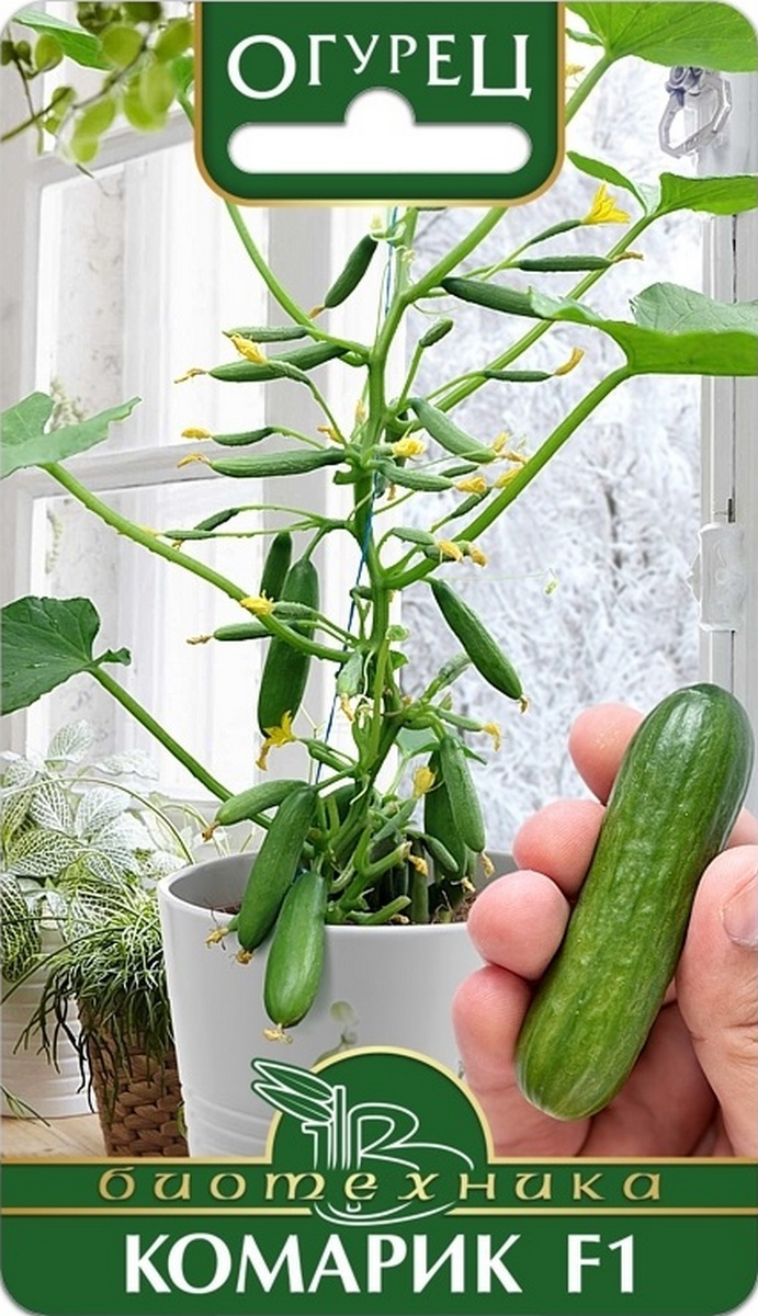 Специальный гибрид для выращивания в горшках. Может выращиваться и плодоносить круглый год как комнатная культура. Многочисленные очень маленькие и сладкие огурчики без шипов. Комарик F1 – 100% партенокарпический гибрид с женским типом цветения. Растение очень компактное, с маленькими листьями, растет медленно. Первый сбор плодов после появления всходов на 55-60 день. Растение очень долго остается зеленым и плодоносящим, настоящая находка для хобби-выращивания. Плоды многочисленные, очень маленькие - 5-6 см, гладкие, блестящие, хрустящие. Генетически свободен от горечи. Предназначен для потребления в свежем виде.