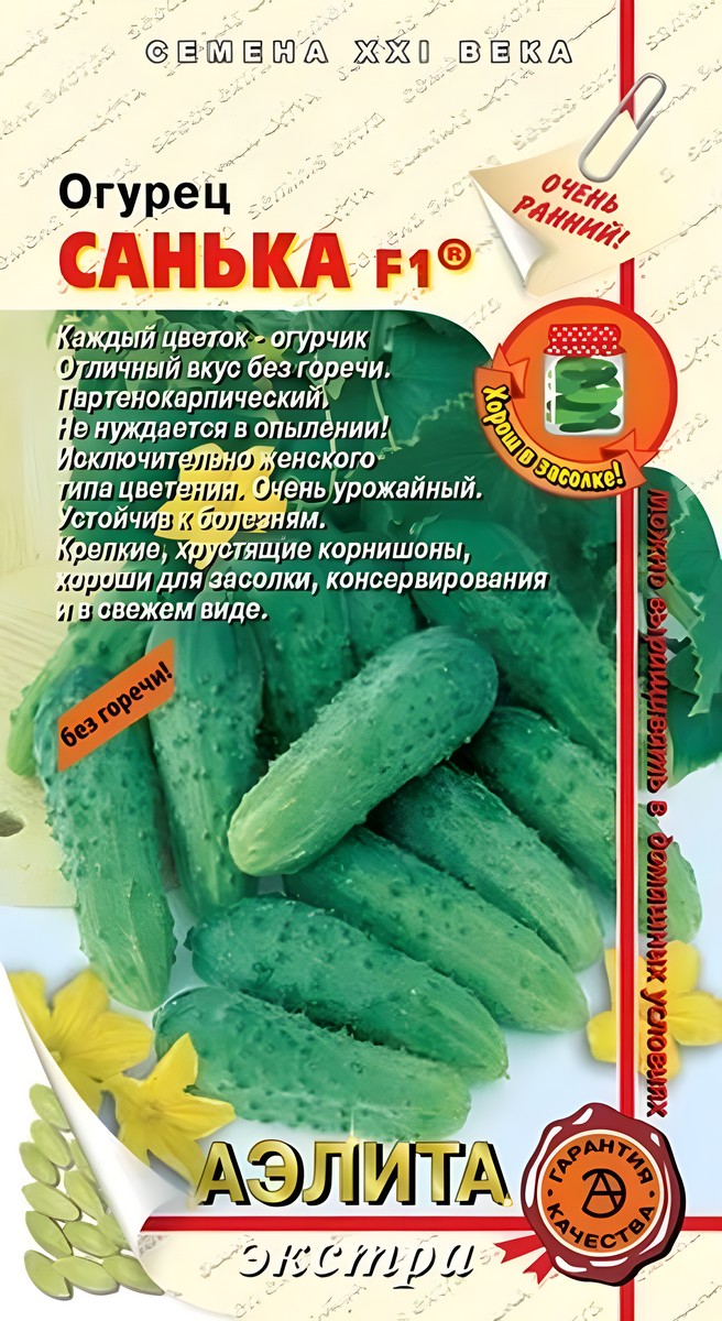 Новый очень ранний партенокарпический гибрид исключительно женского типа цветения для открытого грунта, пленочных укрытий и стеклянных теплиц. Не нуждается в опылении. Гибрид отличается неприхотливостью, высокой урожайностью и долгим периодом плодоношения. Устойчив к основным болезням огурца: вирусу огуречной мозаики, настоящей мучнистой росе, оливковой пятнистости, высоко толерантен к ложной мучнистой росе. Плети растения средней длины. Корнишоны с маленькими семенными камерами, крупнобугорчатые, с небольшим количеством бугорков, насыщенно-зеленые, овально-цилиндрической формы. Зеленцы крепкие, хрустящие, массой 85-110г, длиной 8,5-10,5см, соотношение длины к диаметру – 3,1:1. Очень вкусные, хрустящие в свежем и консервированных виде, а также в засолке. Абсолютно лишены горечи. Компания «АЭЛИТА» является эксклюзивным продавцом семян гибрида огурца «Санька F1»