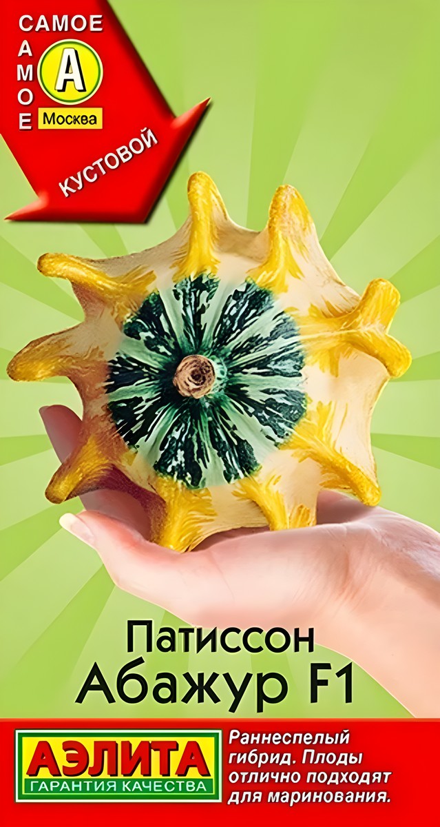 Неприхотливый, урожайный, кустовой гибрид с необычными, яркими плодами. Плотная, хрустящая, нежная мякоть патиссона – отличная диетическая, деликатесная закуска. Фаршированные плоды – украшение стола. Гибрид раннеспелый: сбор урожая следует начинать спустя 45-50 дней после появления всходов. Для цельноплодного консервирования завязи срывают при достижении ими диаметра 4-6 см. Продуктивность одного куста – до 2,5 кг. Плоды отлично хранятся, сохраняя товарные и вкусовые свойства.