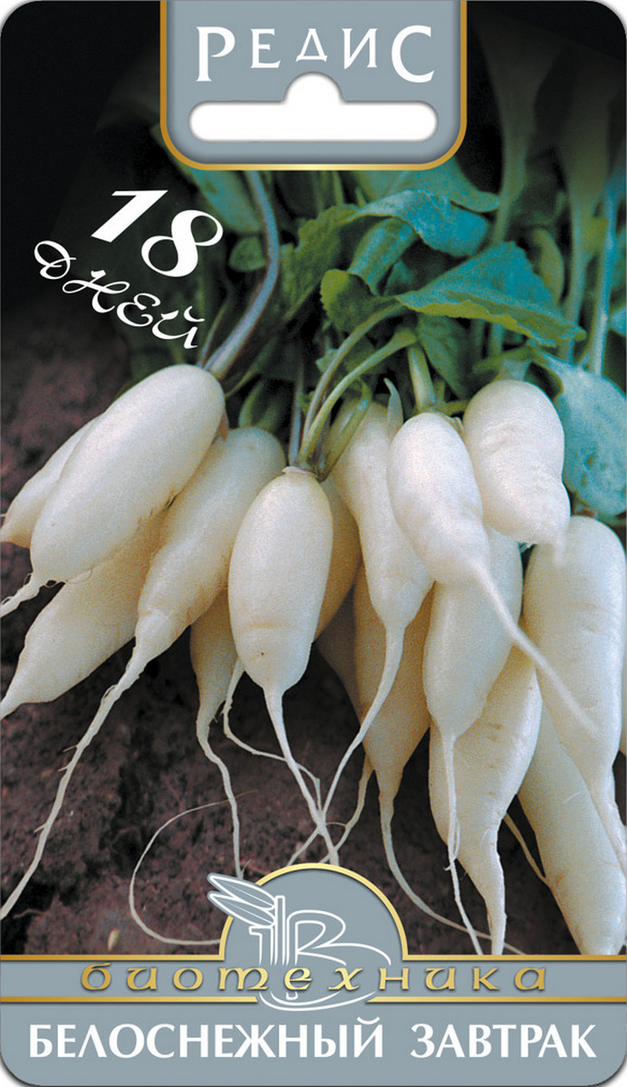 Ультраранний новейший редис. Корнеплод снежно-белый, не крупный, удлиненно-цилиндрической формы. Очень сочный, имеет великолепный товарный вид. Не одревесневает, не растрескивается. Вегетационный период составляет 18-20 дней.