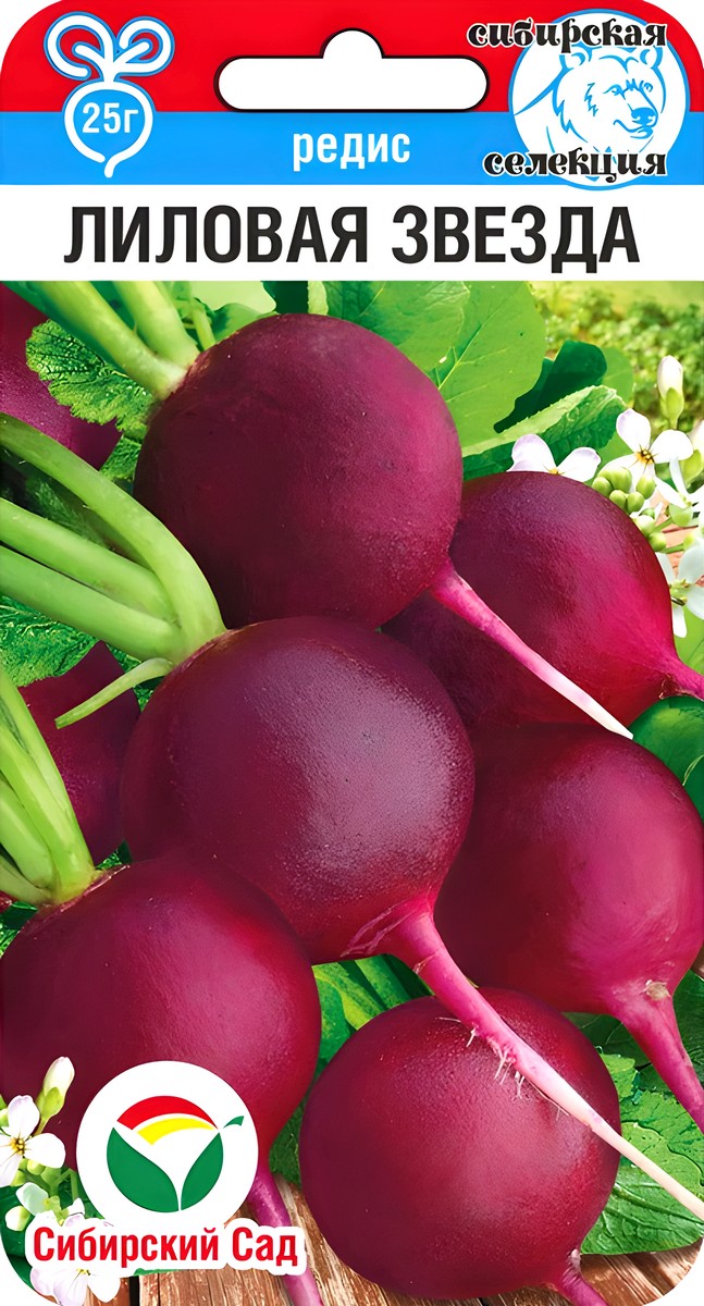 Среднеранний (25-30 дней) урожайный сорт сибирской селекции с яркой бордово-фиолетовой окраской корнеплодов и отличным вкусом белоснежной мякоти. Устойчив к весенним стрессовым погодным условиям, стрелкованию и растрескиванию. Предназначен для выращивания в течение весенне-летнего сезона. Розетка листьев средняя со светло зеленой листвой. Корнеплоды округлые, насыщенно-лилового цвета, крупные, массой до 25г. Мякоть плотная, без пустот, белая, нежная и сочная, полуострого вкуса. Урожайность 1,5-2кг/м2.