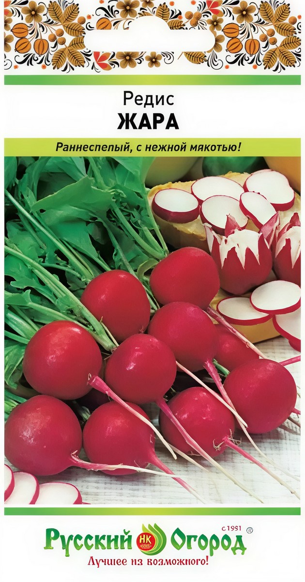 Скороспелый, крупноплодный сорт отечественной селекции. Формирует урожай примерно за 3 недели от полных всходов. Розетка листьев компактная, слабо облиственная. Корнеплоды округлые, темно-красные, плотные, массой 25-30 г. Мякоть белая, сочная, вкус слабоострый, освежающий. Товарная урожайность – 1,5-2 кг/м2. Сорт устойчив к стрелкованию, относительно устойчив к болезням. Посев семян в открытый грунт на глубину 2 см. После появления первого настоящего листа всходы прореживают. Рекомендуется выращивать с расстоянием в рядке 7 см. Чтобы получать урожай в непрерывном режиме, семена высевают несколько раз за сезон с интервалом 15-20 дней. Растениям необходимы регулярные поливы, прополки, рыхления.