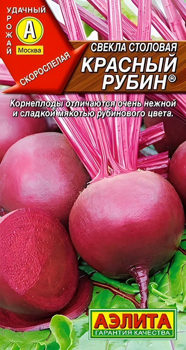 Новый сорт с корнеплодами отличного вкуса. Среднеспелый, от появления всходов до массовой уборки урожая 100- 120 дней. Корнеплоды массой 200-350 г, с тонким осевым корешком. Мякоть бордовая, плотная, сладкая – содержание общего сахара 15-17 %. Кольцеватость отсутствует. Выход товарной продукции 92-97 %. Лежкость при зимнем хранении хорошая. Урожайность 7-8 кг/м2. Перед посевом рекомендуем замочить семена в теплой воде на сутки, 3-4 раза меняя воду. Посев семян в открытый грунт на глубину 1-2 см. В фазе двух-трех настоящих листьев всходы прореживают. Растениям необходимы регулярные поливы, прополки, рыхления. За лето проводят несколько срезок зелени, после каждой срезки растения подкармливают. Для получения более раннего урожая возможен подзимний посев сухими семенами в конце октября – начале ноября.