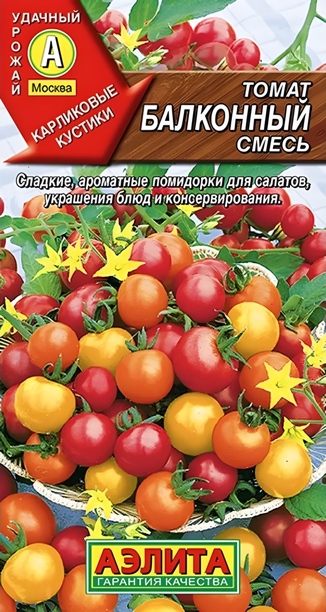 Смесь ультраранних, низкорослых томатов для балкона, открытого грунта, теплиц. Период от всходов до плодоношения 85-90 дней. В состав входят сорта: МОНЕТКА® (плоды желтые), КЛЮКВА В САХАРЕ® (плоды красные) и ДЕТКИ-КОНФЕТКИ® (плоды оранжевые). Растения детерминантные, высотой 45-60 см, штамбовые. Томатики массой 10-15 г, сладкие, ароматные. Использование универсальное.