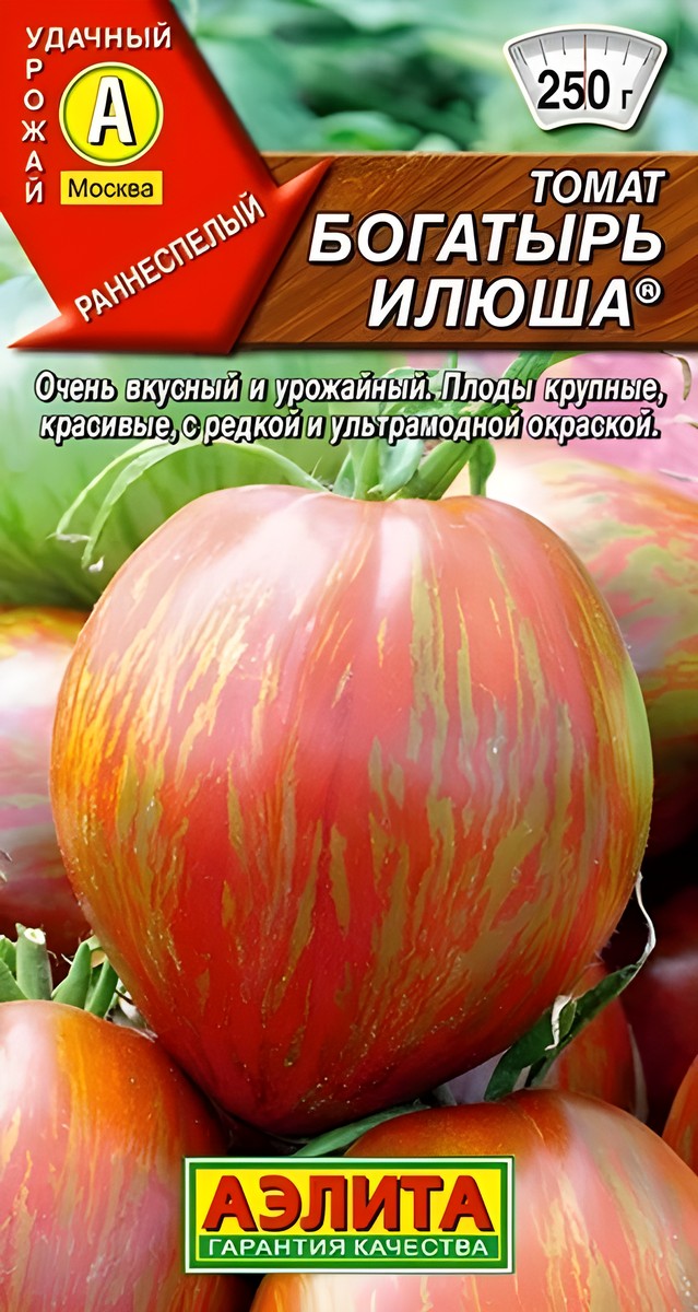 Раннеспелый сорт с крупными, невероятно красивыми плодами. Первый урожай снимают на 95-100 день после всходов. Рекомендуется для теплиц в средней полосе и открытого грунта в южных регионах. Растения индетерминантные, высотой 1,7-1,9 м. Первое соцветие закладывают над 8 листом, последующие – через 1-2 листа. Плоды массой 180-250 г (отдельные могут достигать 300-400 г), плотные, устойчивые к растрескиванию. Томаты сочные, мясистые, обладают приятным помидорным вкусом с фруктовыми нотками. Они великолепны в салатах, подходят для бутербродов и кулинарии. Сорт устойчив к фузариозу. Урожайность высокая – 11-12 кг/м2.