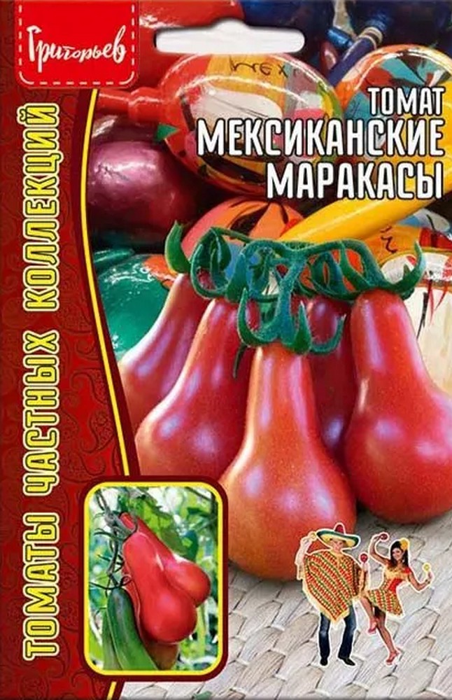 Мексиканские Маракасы – индетерминантный (высотой 1,2-1,3 м, в теплице до 1,8 м), урожайный, среднеспелый (95-110 дней) сорт томата, необычной оригинальной формой плодов похожей на маракасы. Сорт отлично плодоносит как в теплице, так и в открытом грунте. Томаты мясистые, с малым количеством семян, массой 120 – 150 г. Плоды вкусные как в свежем виде, так и во всех видах консервации, прекрасно подходят для сушки и вяления.