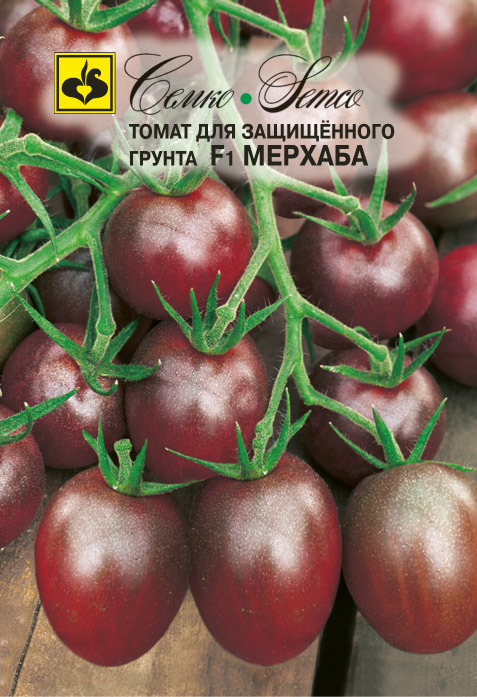 Томат Мерхаба F1 - ранний, индетерминантный гибрид для выращивания во всех типах теплиц и в открытом грунте с подвязкой к опоре. От всходов до созревания плодов 95-100 дней. Растение сильнорослое, первая кисть формируется над 9-11 листом, последующие через 3 листа. Помидоры овальные, гладкие, оригинальной пурпурно-красной окраски с небольшим зелёным пятном у плодоножки, двух-трехкамерные, массой 50-70 г. Мякоть на разрезе тёмно-вишнёвого цвета. Вкус отличный. В кисти одновременно созревают 10-12 плодов. Гибрид жаростойкий и стрессоустойчивый. Товарность и транспортабельность высокие. Томат Мерхаба F1 устойчив к вирусу томатной мозаики (ToMV), относительно устойчив к фузариозу (Fol 1-2) и вертициллёзу (Va, Vd). Используется для потребления в свежем виде. Предназначен для выращивания во всех типах теплиц. Схема посадки 70х40 см. Урожайность свыше 15 кг/м2.