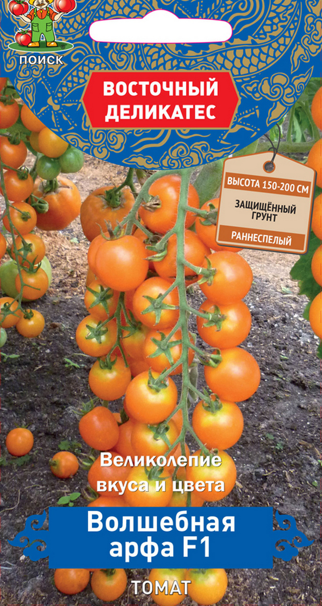 Раннеспелый (90-100 дней) супер сладкий и очень урожайный гибрид черри-томата. Ценится за тяжеловесные многоплодные кисти, вкус и высокую декоративность растений. Мелкие золотистые черри-плодики используют в качестве свежего сладкого десерта для детей и взрослых, отлично подходят для сложных листовых салатов, красивых консервированных ассорти. Гибрид рекомендуется для выращивания в защищенном грунте, в южных регионах прекрасно вызревает в открытом грунте. Растение индетерминантное высотой более 2 м. Формирует сложные веерные кисти с огромным (до 60 шт.) количеством мини-плодов массой 15-20 г. Созревание каждой отдельной кисти массовое, что позволяет за раз собрать достаточный урожай для переработки. Томаты-золотинки содержат большое количество сахаров и минимум кислот. Полезны для детского и диетического питания. Гибрид достаточно устойчив к основным заболеваниям.