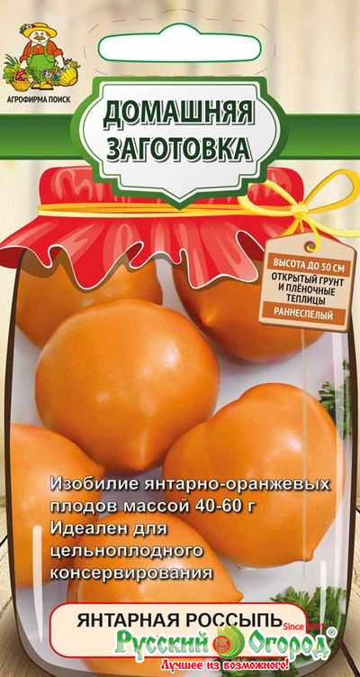 Семена томата Янтарная россыпь (Yantarnaya rossyp) — популярный сорт с яркими оранжевыми плодами. Кусты компактные, вырастают максимум до 50 сантиметров. Это раннеспелый сорт: урожай созревает за 85—95 дней, его можно собирать уже в июле. Растения хорошо приживаются и плодоносят даже в условиях засухи и при перепадах температур. Томат Янтарная россыпь — это мелкие (по 40—60 граммов) плоды с ярко-оранжевой кожурой. Они округлые, с небольшим носиком. Их мякоть плотная, хорошо переносит хранение и транспортировку. Благодаря своим размерам, сорт отлично подходит для приготовления салатов, а также для консервации.