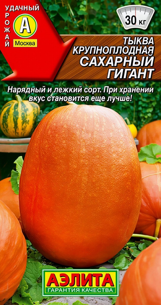 Крупноплодный сорт с невероятно сладкой мякотью. Срок созревания – среднепоздний, от всходов до уборки около 130 дней. Растения мощные, главная плеть длинная. Плоды длиной 40-50 см, массой 4-7 кг (в южных регионах до 12 кг). Семенное гнездо небольшое, основную часть плода составляет мякоть. Она сочная, плотная, хрустящая, темно-оранжевого цвета, с высоким содержанием каротина и сахаров. Прекрасно подходит для использования в свежем виде, приготовления соков и любой кулинарной переработки. Сорт достаточно устойчив к перепадам температуры и засушливой погоде. Плоды хорошо транспортируются на дальние расстояния, хранятся всю зиму. Посев семян в лунку по 2-3 шт. Сеянцы прореживают в фазе 1-2 настоящих листьев. В средней полосе можно выращивать 20-25-дневную рассаду, в О/Г высаживать 05-10.VI. На растении оставляют до 4-5 плодов, прищипывая точку роста на главном стебле и боковых побегах.