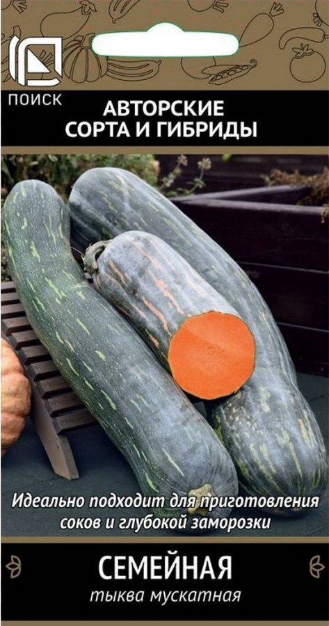 Очень маленькая семенная камера, сплошная мякоть. Вид мускатная. Позднеспелый сорт, период от всходов до первого сбора плодов 130-140 дней. Растение мощное, длинноплетистое. Плоды крупные, цилиндрической формы, длиной до 1 м, темно-зеленые с восковым налетом, массой до 35 кг. Семенная камера маленькая, находящаяся в вершиной части плода. Мякоть оранжевая, хрустящая, плотная. Идеально подходит для приготовления сока, первых блюд и для глубокой заморозки. Два-три растения на участке достаточно для обеспечения средней семьи полезной и диетической продукцией. В средней полосе хорошо выращивается через рассаду.