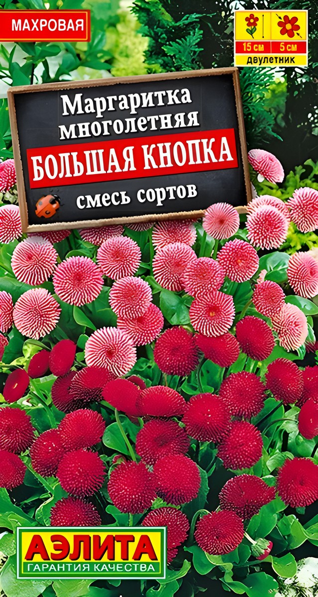 Неприхотливое, очень зимостойкое растение из семейства Астровые высотой 12 см. Цветет в апреле-июле, при хорошем уходе цветение продолжается до осени с перерывом в жаркий период сезона. Соцветия в виде плотных помпонов, 3 см в диаметре, белой, розовой, красной окраски. Хорошо растет на любых почвах. Светолюбивое растение, но хорошо выдерживает легкое затенение. Семена высевают в конце июня - начале июля в открытый грунт, всходы появляются через 7-10 дней. Маргаритка прекрасно подходит для выращивания на клумбах, рабатках и в бордюрах, а также в горшках и балконных ящиках.