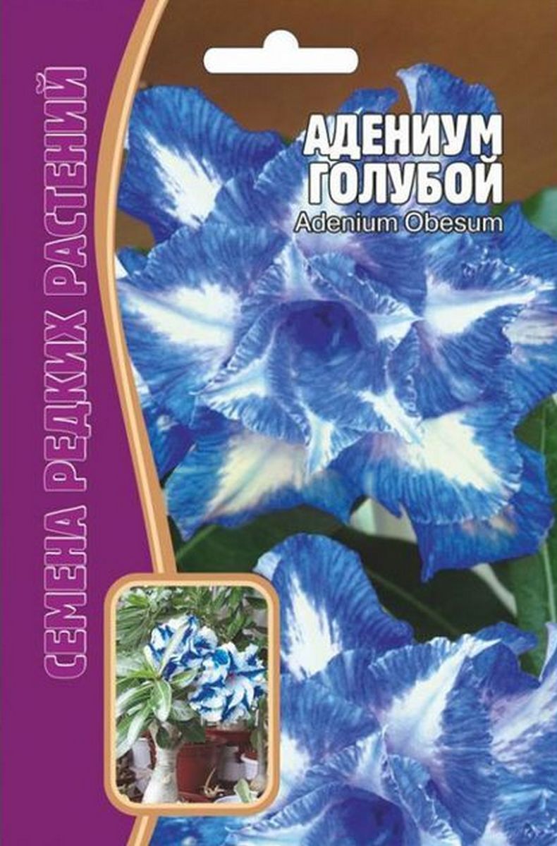 Адениум Голубой от производителя Редкие семена. Сорт цветет с весны по осень. Красивый цветок, отличающийся оригинальной цветовой гаммой. Данный экземпляр характеризуется двухцветной окраской бело-голубых тонов. Ствол имеет утолщение в нижней части. Листья темно-зеленые, заостренные. Многолетний вид, способный цвести круглый год. Для ускорения роста используют биостимуляторы и специальный грунт, состоящий из вермикулита и торфа в пропорции 2к1 и древесный уголь. Выращивают через посев семян, выкладываемых на поверхность влажной земли, не присыпая, прикрыв пленкой. Семена рекомендуется продезинфицировать. Не переносит сквозняки, прямой солнечный свет, низкую температуру.