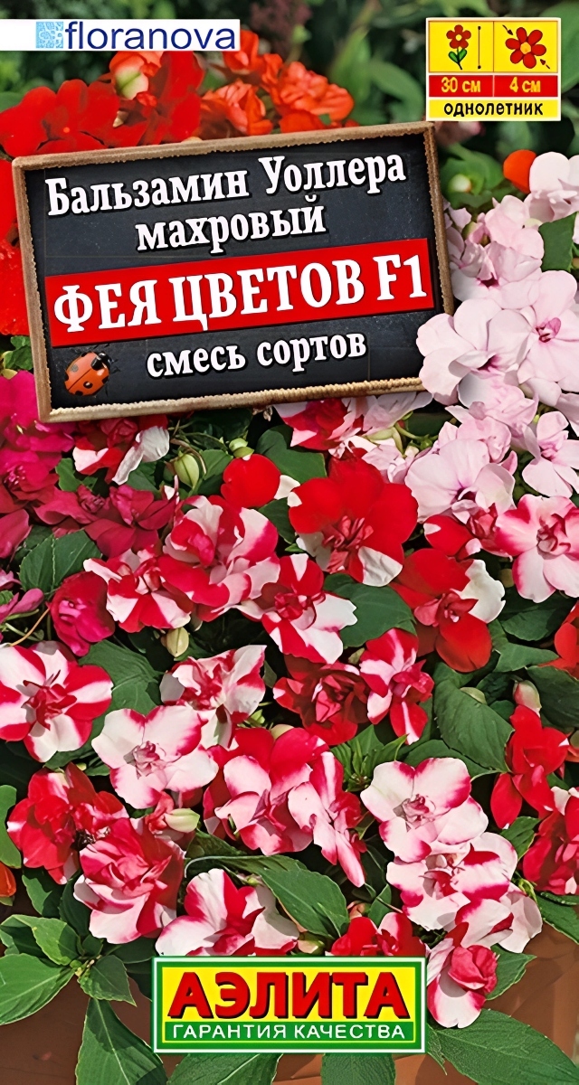 Популярное комнатное растение и садовый летник. Гибриды ФЕЯ ЦВЕТОВ F1 имеют эффектные махровые цветки диаметром 4 см, напоминающие бутоны роз. Обильное цветение начинается уже через 6 недель после всходов и продолжается все лето. Растения крепкие, 30 см высотой, с прекрасной формой куста, хорошо смотрятся в балконных ящиках, уличных контейнерах, на клумбах. Нетребовательны к освещению, посадки можно размещать в полутенистых местах. Бальзамин теплолюбив, влаголюбив (но не переносит избыточного увлажнения), требует легких плодородных почв и защиты от ветра. Посев на рассаду в феврале-марте, поверхностный или с очень слабой заделкой семян. Всходы появляются через 2-3 недели. При появлении первого настоящего листа сеянцы пикируют. Высадка в открытый грунт закаленной рассады в конце мая-начале июня.