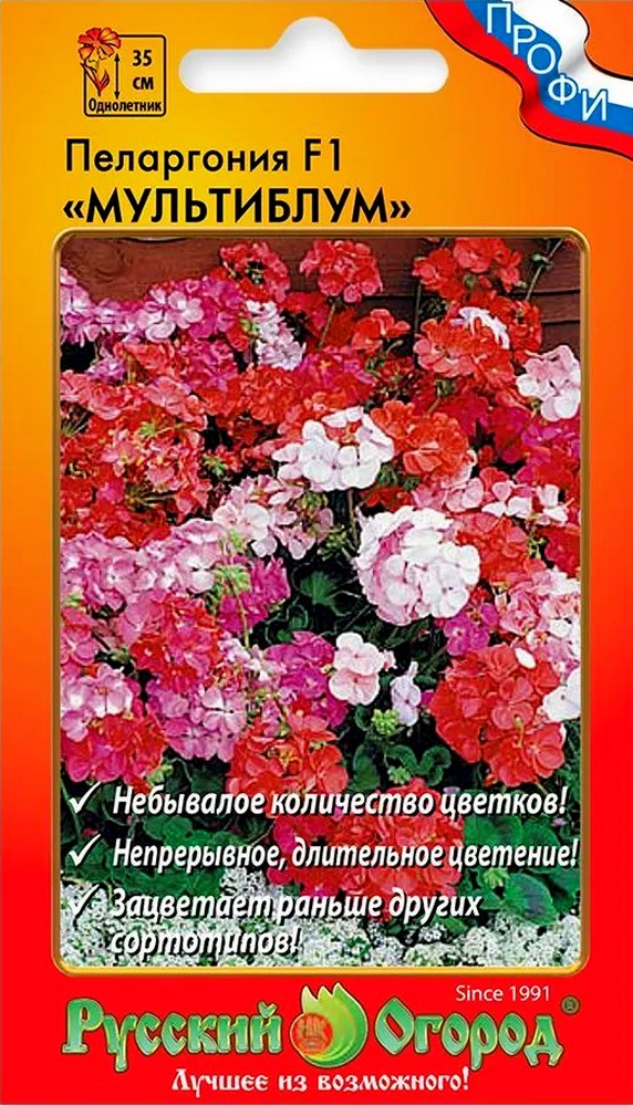Герань Мультиблу смесь F1 – один из самых ранних сортов герани! Зацветает через 10 – 12 недель, то есть примерно за месяц до основного массового цветения гераней. Её цветы очень яркие: конфетно-розовые, оранжевые, красные, белые! Прекрасная смесь, которую мы очень рекомендуем для невысоких садовых посадок (включая вазоны или специальные кашпо), а также для балконов и террас! Отлично развиваются, соцветия очень плотные. В них собрано намного больше цветочков, чем обычно.Герань Мультиблу смесь F1 в высоту достигает 30 см – 40 см. В саду это отличный вариант для переднего плана посадок, при этом основная окраска цветника может быть как розовой, так и лиловой, фиолетовой, синей или красной. В балконных посадках же вы можете просто высадить Мультиблу F1, чего будет полностью достаточно.Герань Мультиблу F1 стоит высаживать на рассаду в начале марта. Температура должна быть около +20°С, земля должна быть всегда увлажнена, правда не следует слишком часто поливать. Просто следите, чтобы почва не пересыхала.