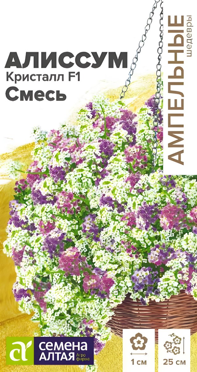 Алиссум Clear Cristall (лобулярия)– превосходный гибрид ампельного типа. Отличается более высокой выносливостью, чем обычные диплоидные серии. Растение компактное, высотой 15-25 см, в поперечнике до 30-35 см, образует сплошной цветущий шар. Плети, покрытые крупными ароматными соцветиями разных окрасок: белой, розовой, фиолетовой, достигают в длину 35см. Сорт отличается выносливостью и устойчивостью к пониженным температурам. Отлично подходит для выращивания в контейнерах, подвесных кашпо и на клумбах, широко используется как фон для других ярких цветов. Для непрерывного цветения следует удалять увядшие соцветия.Растение холодостойкое, предпочитает легкие питательные почвы с небольшим содержанием извести и хорошее освещение. Семена на рассаду высевают в конце марта – начале апреля. Мелкие семена не слишком густо распределяют на поверхности увлажненного субстрата и слегка вдавливают в него, не присыпая сверху. Емкость накрывают пленкой или стеклом до появления всходов, высадка рассады в грунт – в конце мая.