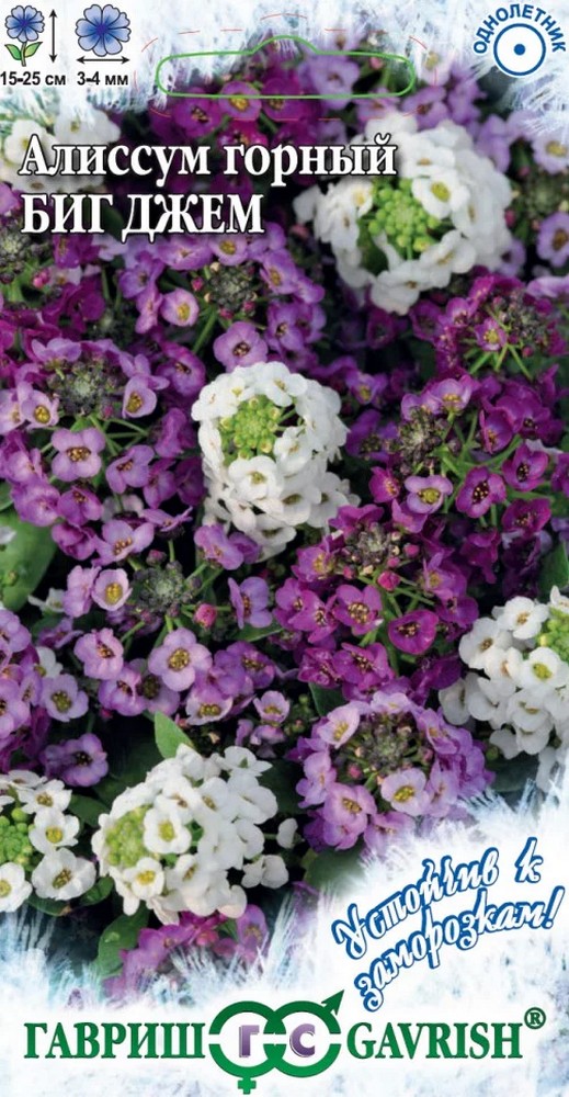 Яркая смесь однолетних, низкорослых растений, высотой 15-25 см. из семейства Крестоцветные. Быстро разрастается, не боится засушливой погоды. Цветки мелкие, 3-4 мм в диаметре, с сильным ароматом меда, собраны в кистевидные соцветия, плотно покрывают растения во время цветения. Окраска соцветий различная: белая, сиреневая, лиловая, фиолетовая. Цветет с конца июня до октября. Дает обильный самосев. Для получения дружных всходов семена необходимо стратифицировать при температуре +10оС.