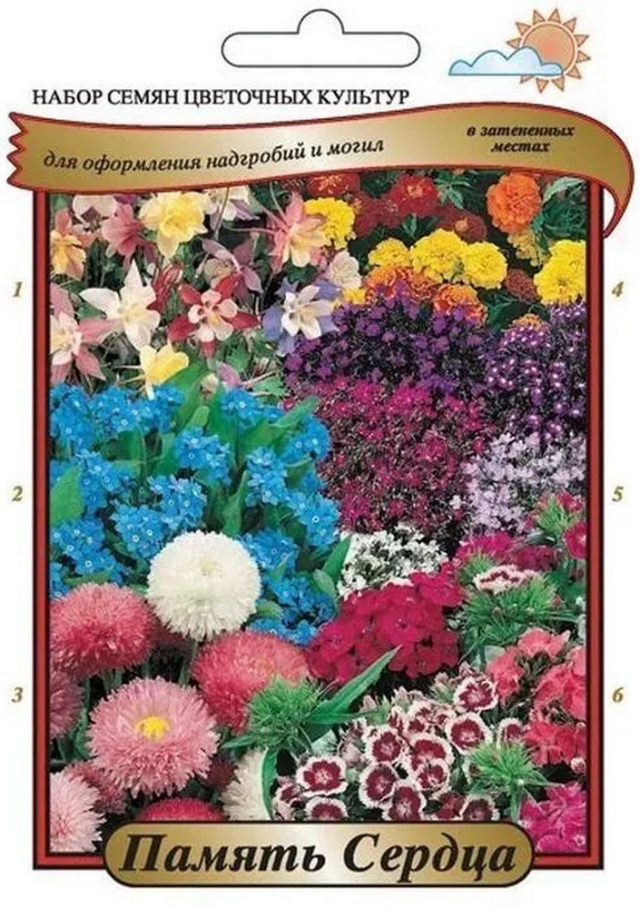 Набор семян для оформления участков, расположенных в затененных местах.Включает семена многолетних и однолетних культур в отдельных пакетиках: аквилегия, бархатцы отклоненные, незабудка альпийская, маргаритка, лобелия, гвоздика турецкая.