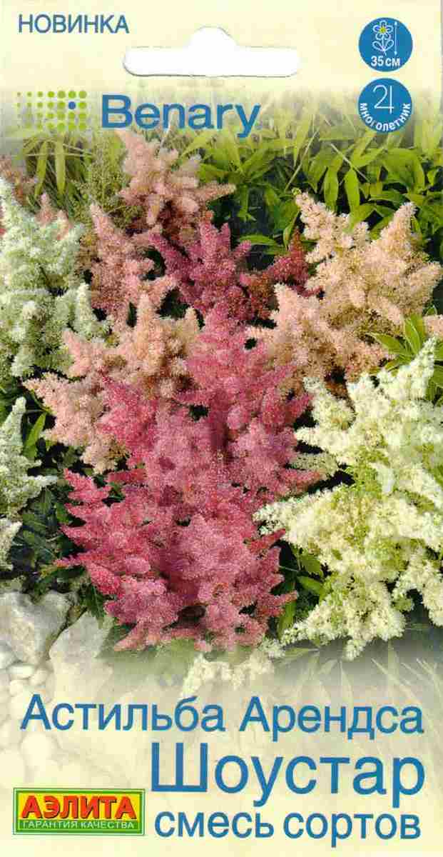 Многолетняя зимостойкая культура. Пользуется заслуженным вниманием у цвеоводов, так как используется при составлении практически всех садовых композиций. Растения среднерослые, высотой около 30-35 см. Предпочитают полутень и прохладу, устойчивы к болезням и вредителям. Блестящие рассеченные листья собраны в густую прикорневую розетку. Длина пушистых метельчатых соцветий достигает 15-20 см. Пик цветения взрослых растений приходится на июль. Астильбу можно размножать делением куста каждые 3-4 года. Она хорошо растет во влажной почве вокруг декоративных водоемов, образует выразительные бордюры вдоль дорожек. Смесь красочных соцветий великолепна в букете. Семена в гранулах! Посев с минимальной заделкой семян при обеспечении стабильной влажности грунта. При температуре +22...+25С, всходы появляются через 10-15 дней. При появлении пары настоящих листьев сеянцы пикируют. В августе молодые растения высаживают на постоянное место и в первую зиму укрывают. Ежегодный прирост корневища у астильбы составляет 3-5 см, она н