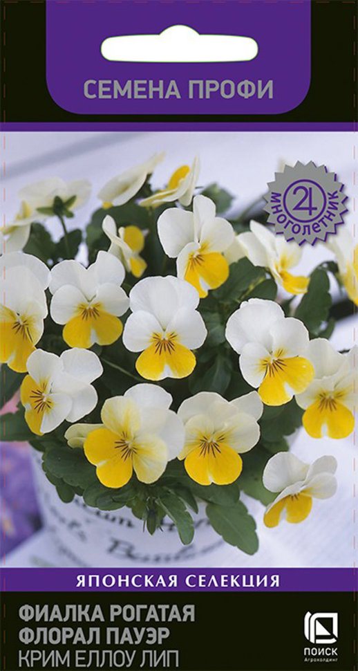 Семена Фиалка рогатая Флорал Пауэр Крим Еллоу Лип. Растение компактное, с отличным ветвлением, формирует куст шарообразной формы, высотой - 13-18 см. На одном растении одновременно цветет множество цветков. Диаметр цветка 2,5-3 см. Окраска - двухцветная бело-желтая. Обильное ветвление и устойчивость к вытягиванию. Хорошая переносимость жарких условий, прекрасная зимостойкость. Используют для бордюров, альпинариев и миксбордеров