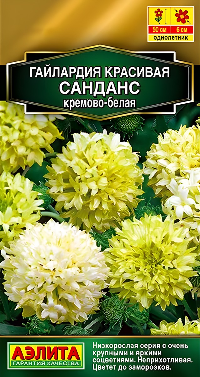 Новая серия низкорослой однолетней гайлардии "Санданс" (Sundance) европейской селекции. Высокоустойчива к капризам по годы. Неприхотлива и очень декоративна до осенних заморозков. На протяжении лета растения непрерывно образуют пышные махровые шаровидные соцветия Ø 5-6 см. Компактные кустики высотой около 40- 50 см эффектно выглядят при высадке группами в рабатках и бордюрах. Это великолепная срезочная и горшечная культура, надолго сохраняющая прекрасный облик.