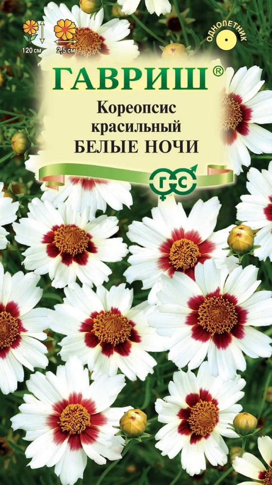 Кореопсис — очень простое в выращивании растение, которое ценится за свою нежную декоративность. Идеально подходит для садов в деревенском, сельском, натуралистическом стиле. Белоснежные сияющие цветки с ярким, насыщенно-бордовым центром расположенные на тонком прямом ветвистом стебле будут радовать своим обильным и ранним цветением с июля до заморозков. Листочки у кореопсиса красивого зеленого оттенка, дважды перисто-рассеченные на линейные доли. Однолетнее растение обладает быстрым ростом, предпочитает открытые солнечные места на плодородных, достаточно увлажненных почвах, холодостойко. На рассаду семена высевают в апреле, в грунт высаживают в мае, непосредственно в открытый грунт — в апреле-мае или под зиму. Неприхотливость и нарядное цветение сделали кореопсис очень востребованным растением в ландшафтном дизайне. Прекрасно смотрится как отдельный пышный куст, а также может украсить любой цветник, создавая контраст для растений с более спокойными расцветками.