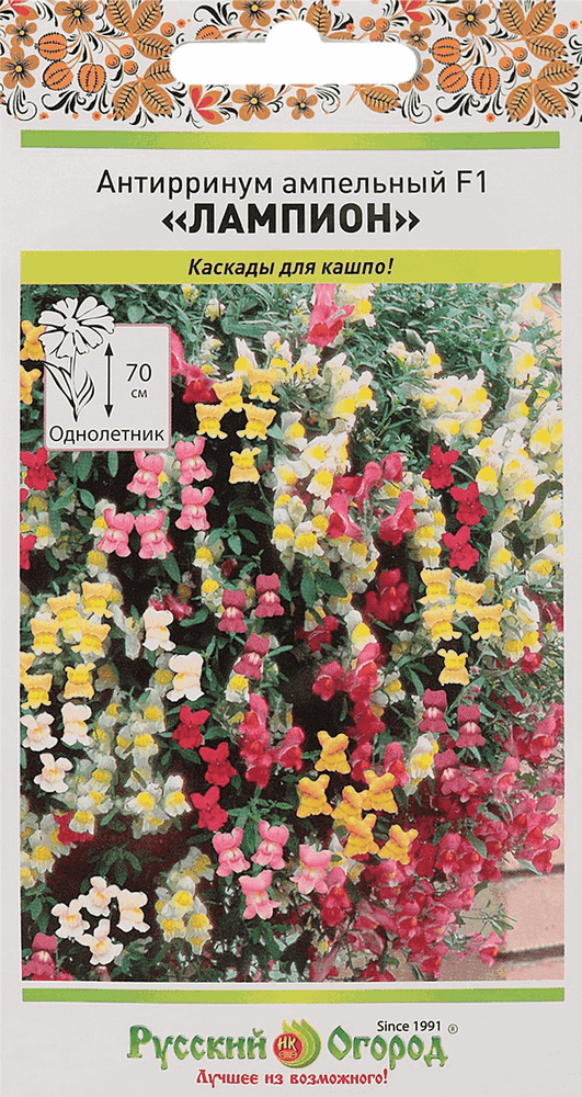 Антирринум Лампион F1 – уникальный ампельный гибрид львиного зева для балконов, кашпо и подвесных корзин! Жёлтые, красные, розовые, оранжевые и белые гроздья цветов будут изящно цвести всё лето на побегах, длиной 50 см – 70 см. При этом в конце сезона кашпо и контейнеры можно занести в освещённое более тёплое помещение, где львиный зев продолжит цветение. Нам кажется, что это действительно идеальное растение для оформления сада, летних веранд или беседок!