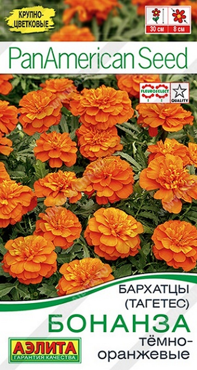 Бархатцы американской селекции Бонанза – абсолютный лидер продаж! За декоративные свойства удостоены международной награды. Сорт удивительно крупноцветковый для отклоненных (французских) бархатцев, цветки диаметром 5-8 см! Растения низкорослые, высотой 25-30 см. Кустики плотные, густые, компактные, зацветают рано. Отлично адаптируются к различным условиям выращивания. При этом сохраняют потрясающую «сочность» апельсинового оттенка соцветий и по-настоящему роскошное и пышное цветение. Это идеальное украшение садовых клумб в качестве ковровых посадок, а также находка для балконных контейнеров и горшков. Бархатцы предпочитают солнечные участки с дренированными, плодородными почвами нейтральной кислотности. Растения теплолюбивые, быстрорастущие, взрослые – достаточно засухоустойчивые.