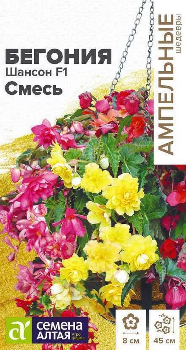 Непревзойденная по декоративности ампельная бегония Шансон смесь F1 - с махровыми и полумахровыми камелиевидными цветками. Имеет от 5 до 8 основных побегов 45 см длиной. Цветение обильное и продолжительное, цветки крупные, темно-красного бархата. Изящно изогнутые стебли особенно эффектно смотрятся в вазонах, кашпо и в подвесных корзинах – везде, где выгодно подчеркивается ампельная форма растений. Растения декоративны круглый год, поэтому бегонию часто выращивают как многолетнее комнатное растение. Растения образуют крупные клубни, которые можно сохранить до следующего сезона. Бегония Шансон смесь F1 - предпочитает светлые или полутенистые места, почву, богатую органикой, а также постоянное увлажнение. Посев на рассаду с февраля до апреля. Февральским посевам требуется дополнительная подсветка. Всходы появляются на 5-6 день. Пикировка в фазе 1-2-х настоящих листьев. Высадка в грунт закаленной рассады в конце мая. Для продолжительного и обильного цветения растениям необходим своевременный полив.