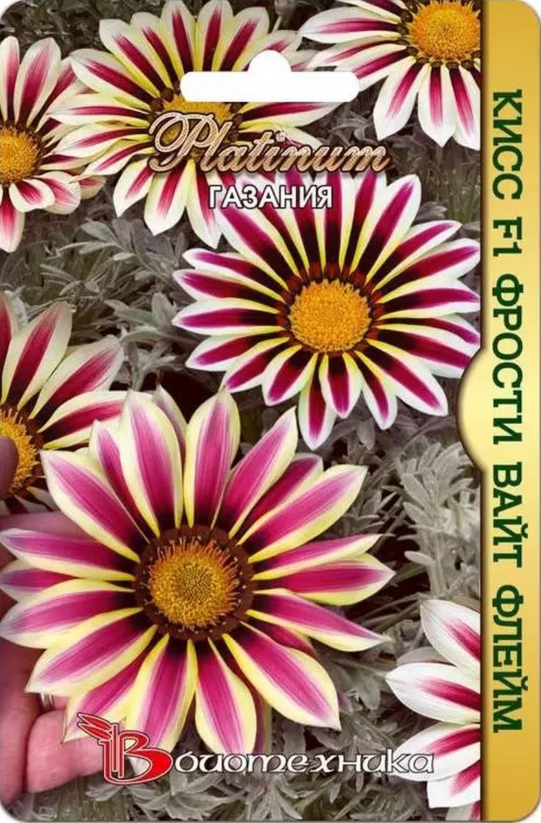 Серия «Фрости Кисс F1» зацветает раньше большинства известных гибридов этой культуры. Цветки максимально крупные для гацаний – 10-12 см. Они расположены над серебристо-зелеными листьями, дружно и непрерывно распускаются до осени. Мощная корневая система и декоративная опушенность листьев обеспечили серии феноменальную устойчивость к засухе, жаре, прямым солнечным лучам. Растения образуют густые, компактные листовые розетки, высотой и шириной около 20-25 см. Гацании великолепно выглядят в цветниках, на каменистых горках, в качестве срезочной и бордюрной культуры. Многолетник по своей природе, но в условиях открытого грунта средней полосы не зимует, выращивается как летник. Осенью гацанию пересаживают в вазоны и заносят в дом, чтобы обеспечить ей зимовку в светлом прохладном помещении (+8...+10°С). Растению необходимы легкие питательные почвы, без избытка влаги.